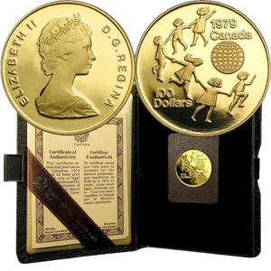 The 1/2 oz $100 International Year of the Child Gold Coin 1979 is a commemorative coin featuring a stylized design of children playing and linking arm in arm. The obverse is completed with a sphere in the middle of the children and lettering "1979 Canada" and face value $100. Celebrate Canadian History by adding the 1979 International Year of the Child Gold Coin to your collection today!
