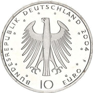 The 2004 German 10 Euro silver coin commemorates the 200th birthday of poet Eduard Mörike. Designed by Erich Ott and minted in Stuttgart (mint mark "F"), this coin is part of Germany's Euro commemorative series.