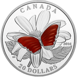 A Royal Canadian Mint first, the $20 Colourful Wings of a Butterfly Silver Coin features semi-precious gemstones carved into butterfly wings. Adorned with a translucent agate, this coin is a unique keepsake.