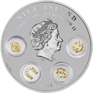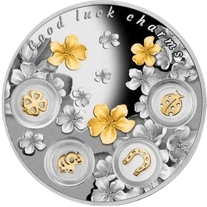 A stunning keepsake from the Mint of Poland, Good Luck Charms Silver Coin is a great gift idea. The surface is adorned with floral ornaments and four transparent capsules containing silver filigree inserts as the charms - four leaf clover, horseshoe, ladybug, and elephant. Each symbol in the Good Luck Charms Silver Coin is plated with 24-karat gold.