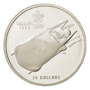 The $20 Calgary Olympics Bobsled Silver Coin was minted in 1987, 1 year prior to the Olympics. This coin has a denomination of $20 and is minted with .925 fine silver, symbolizing both its numismatic and intrinsic value.