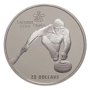 The $20 Calgary Olympics Curling Silver Coin was minted in 1987, 1 year prior to the Olympics. This coin has a denomination of $20 and is minted with .925 fine silver, symbolizing both its numismatic and intrinsic value.