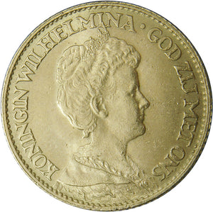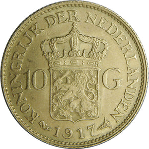 The 10 Gulden gold coin from 1917 is a Dutch coin minted during the reign of Queen Wilhelmina. Containing 6.72 grams of 90% pure gold, it features her portrait on the obverse and the Dutch coat of arms on the reverse. Today, they are valued by investors and collectors for their historical and gold content.