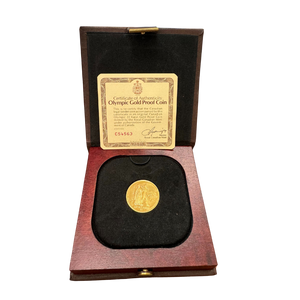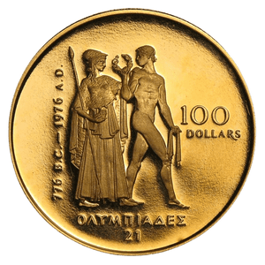 The Royal Canadian Mint produced this 22k gold proof coin to commemorate the 21st Summer Olympic Games that were held in Montreal, 1976. The $100 Montreal Olympics 22k Gold Coin 1976 features the famous Olympiad design of an ancient Grecian athlete being crowned with laurel by the goddess Pallas Athena.