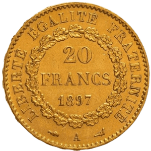 • Reverse: face value 20 Francs with year 1897, surrounded by a wreath