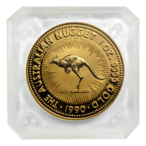 The 1 oz $100 Australian Nugget Gold Coin by the Perth Mint from Australia, features a Whiptail Wallaby standing amongst stylized sun rays with Joey in pouch. Gold Kangaroos have been produced by the Perth Mint since 1989 and are one of the purest gold coins in the world with 99.99% purity. The motif of the Australian Nugget Gold Coin varies every year, get this one today!