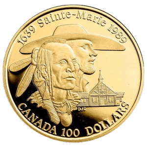 The 1/4 oz $100 Sainte-Marie Gold Coin produced by the Royal Canadian Mint commemorates the 350th anniversary of the first European settlement in Ontario. Sainte-Marie among the Hurons was established in 1639 and became the Jesuit headquarters in Huronia. The Sainte-Marie gold coin is composed of 58.33% gold and 41.33% silver.