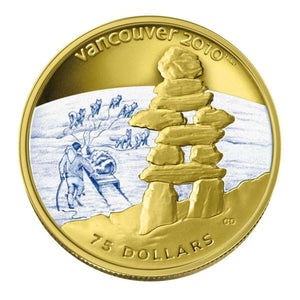 The $75 Gold Coin "Vancouver 2010 Olympic Winter Games: Inukshuk" honors the Inukshuk, a traditional stone landmark used by Indigenous peoples of Canada’s Arctic, symbolizing guidance, community, and resilience. Crafted in 14KT gold, this coin features a beautifully detailed Inukshuk design, embodying the Olympic values of friendship and unity. Part of the Vancouver 2010 Olympics commemorative series, it celebrates both Canada’s cultural heritage and the spirit of the Games. With its 14KT gold composition and exceptional craftsmanship, this coin is a treasured collectible that pays homage to Indigenous traditions and Canada’s role as host nation. Encased for preservation, it’s a meaningful addition for collectors and admirers of Canadian heritage.