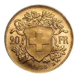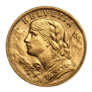 The Vreneli Helvetia Gold Coin is a also called as Tête d'Helvetia in French. The name is derived from "Verena", the personification of the Confederation of Switzerland in the female effigy. Helvetia is a variation of the official Latin name of Switzerland. The 20 Francs Vreneli Helvetia Gold Coin can be issued from any year between 1897 - 1949, based on availability.