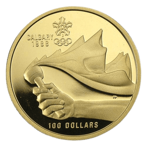 The $100 Calgary XV Olympics Gold coin is a commemorative coin celebrating the XVth Winter Olympic Games that took place in Calgary, Alberta. The coin has a beautiful design of a hand holding the Olympic Torch with a stylized image forming an image of the Canadian Rocky Mountains. The Calgary XV Olympics gold coin is a must-have for every collector invested in Canada's legacy.